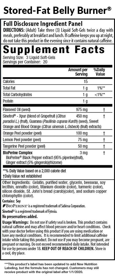 Flaxseed Oil (seed) 975 mg, Sinetrol® Xpur (blend of Grapefruit (Citrus paradisi L.) (fruit), Guarana (Paullinia cupana Kunth) (seed), Sweet Orange and Blood Orange (Citrus sinensis L. Osbeck) (fruit) extracts) 450 mg, Orange Peel powder (peel) 100 mg, Lemon Peel powder (peel) 75 mg, Tangerine Peel powder (peel) 50 mg, BioPerine Complex 3 mg: BioPerine® Black Pepper extract (95% piperine)(fruit), Ginger extract (5% gingerols)(rhizome)